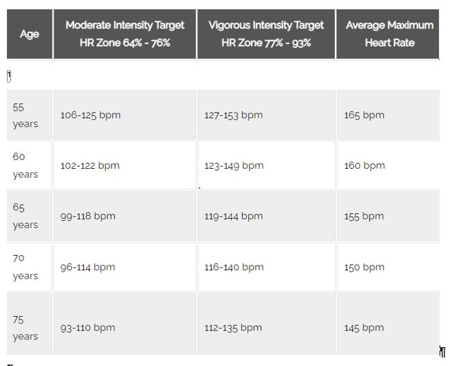The following table, which is centered on your current heart rate level (which follows the Karvonen formula[4]) provides some of the information you may need to guide you towards an acceptable heart rate range for your age group. Notice that it goes up in five-year spans, so, once again pick the one closest to your age.