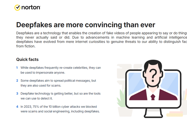 A deepfake refers to a specific kind of synthetic media where a person in an image or video is swapped with another person’s likeness.